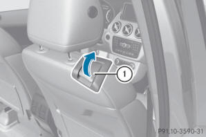 Pociągnąć uchwyt blokady 1 i przechylić oparcie całkiem na poduszkę fotela, aż do zablokowania.